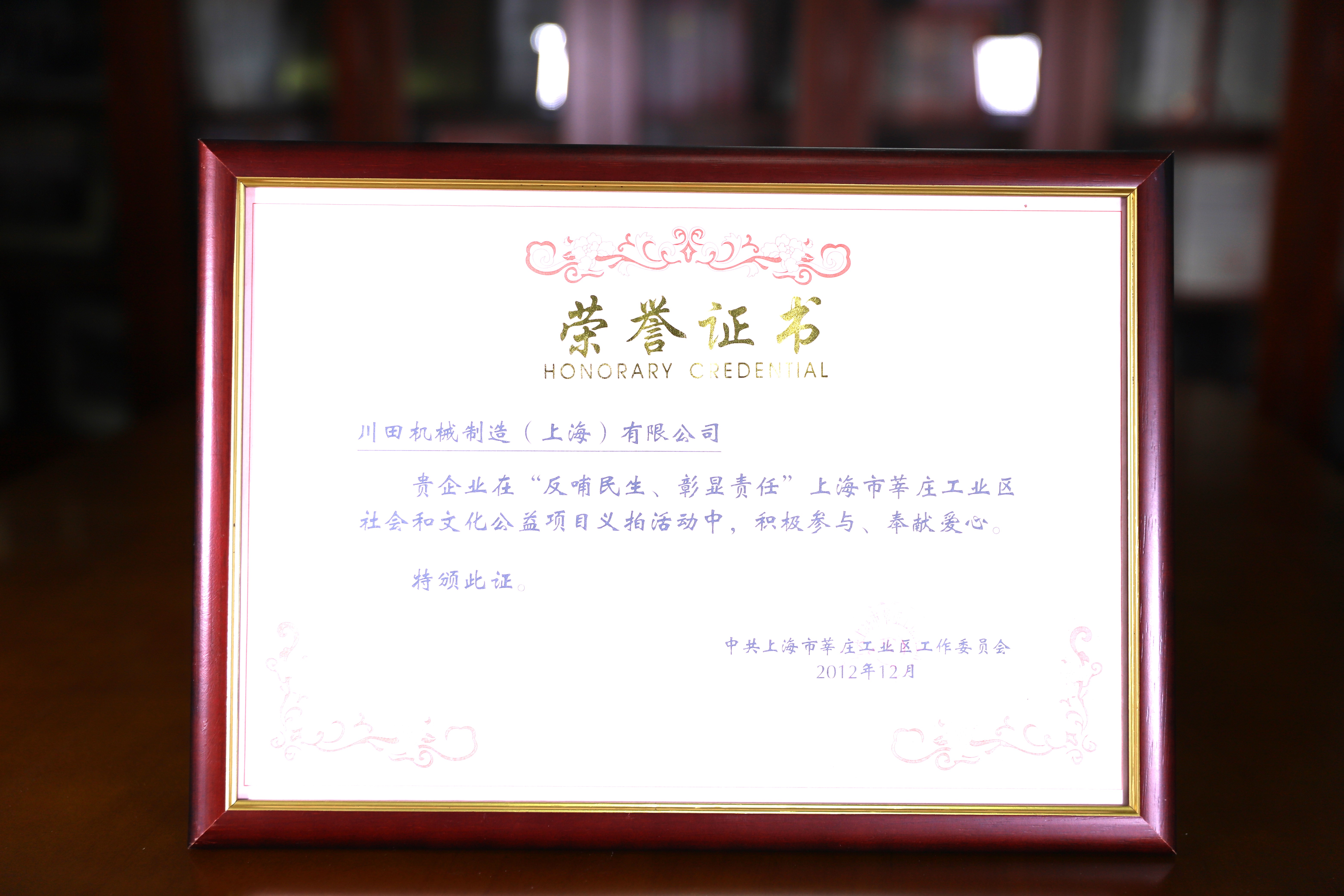 2012 莘莊工業(yè)區(qū)社會(huì)和文化公益項(xiàng)目榮譽(yù)證書