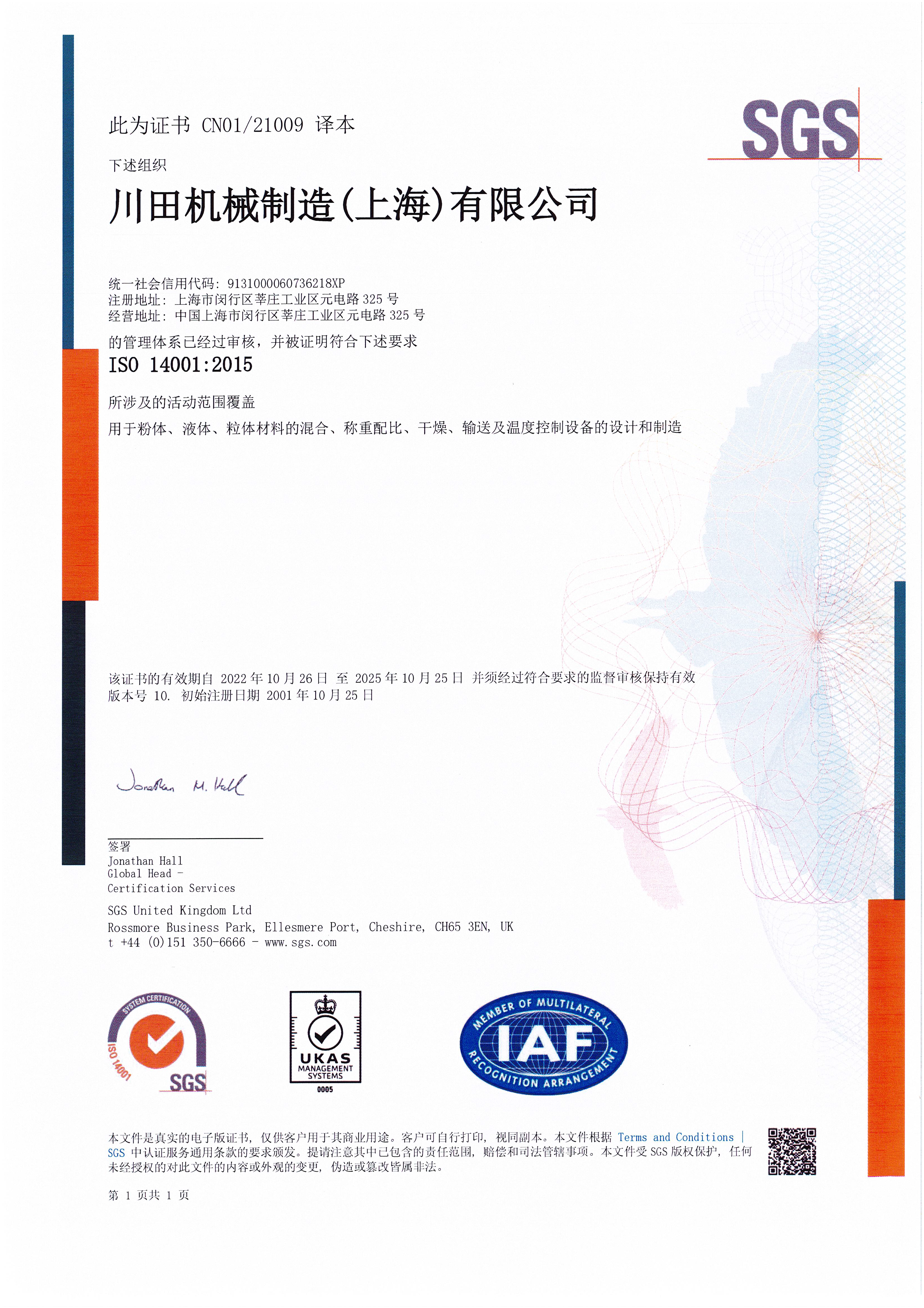 ISO14001証書(2022.10.26-2025.10.25)