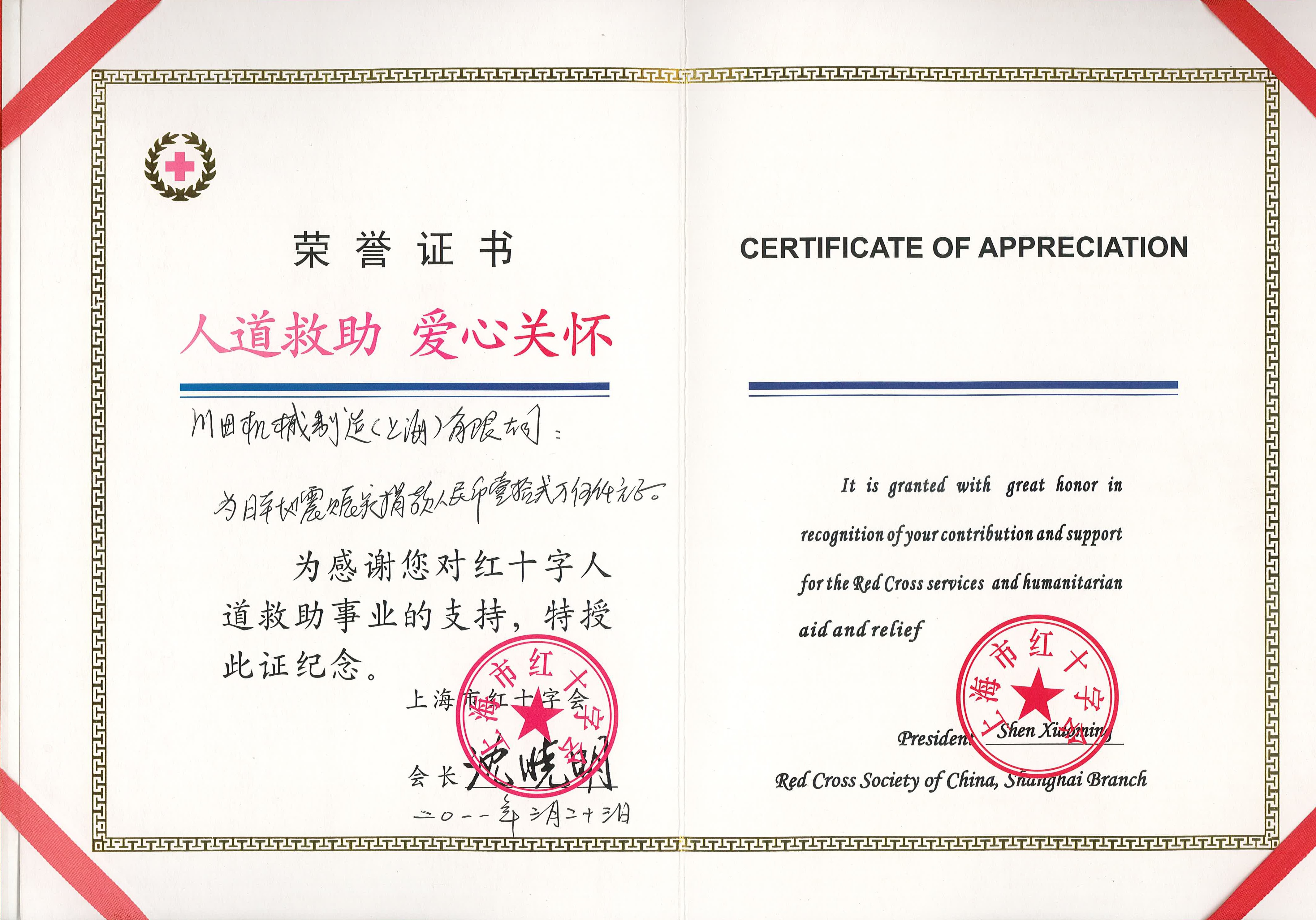2008年度上海市赤十字栄譽(yù)証書-川田機(jī)械